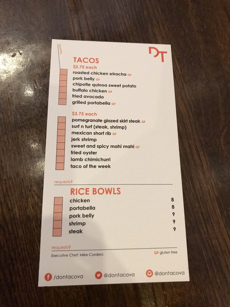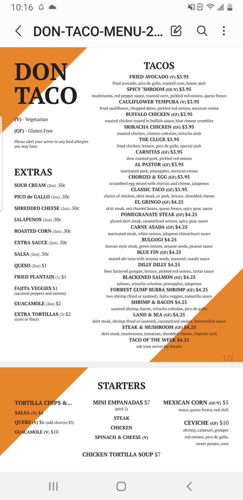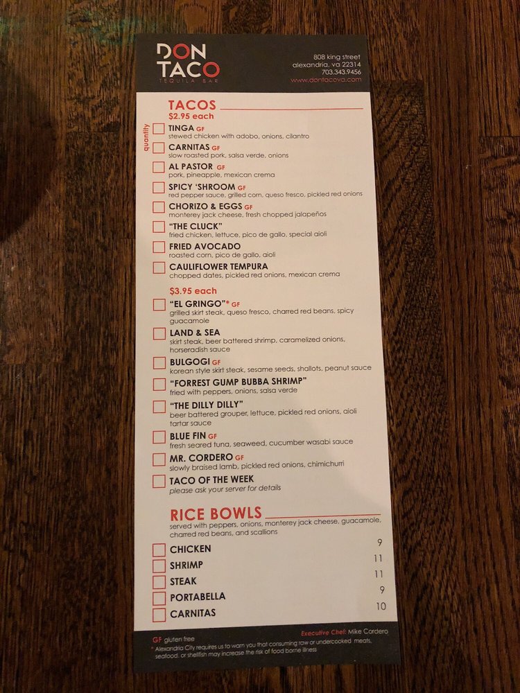 Introducing Don Taco, a Mexican cocktail bar located at 808 King St Alexandria, VA. Known for their extensive menu options, including tacos, starters like chips & salsa, and burritos & more. Don Taco offers a variety of vegetarian, pescatarian, and vegan options, ensuring there's something for everyone. Customers rave about the flavorful dishes, such as the Buffalo Chicken tacos and the Chicken Tortilla Soup. The casual yet trendy atmosphere makes it perfect for lunch, dinner, or late-night gatherings. With amenities like outdoor seating, a full bar, and happy hour specials, Don Taco provides a vibrant dining experience. Whether you're looking for a family meal, a night out with friends, or a date night spot, Don Taco has something for every occasion. Visit Don Taco and indulge in delicious Mexican cuisine that will leave you craving more.